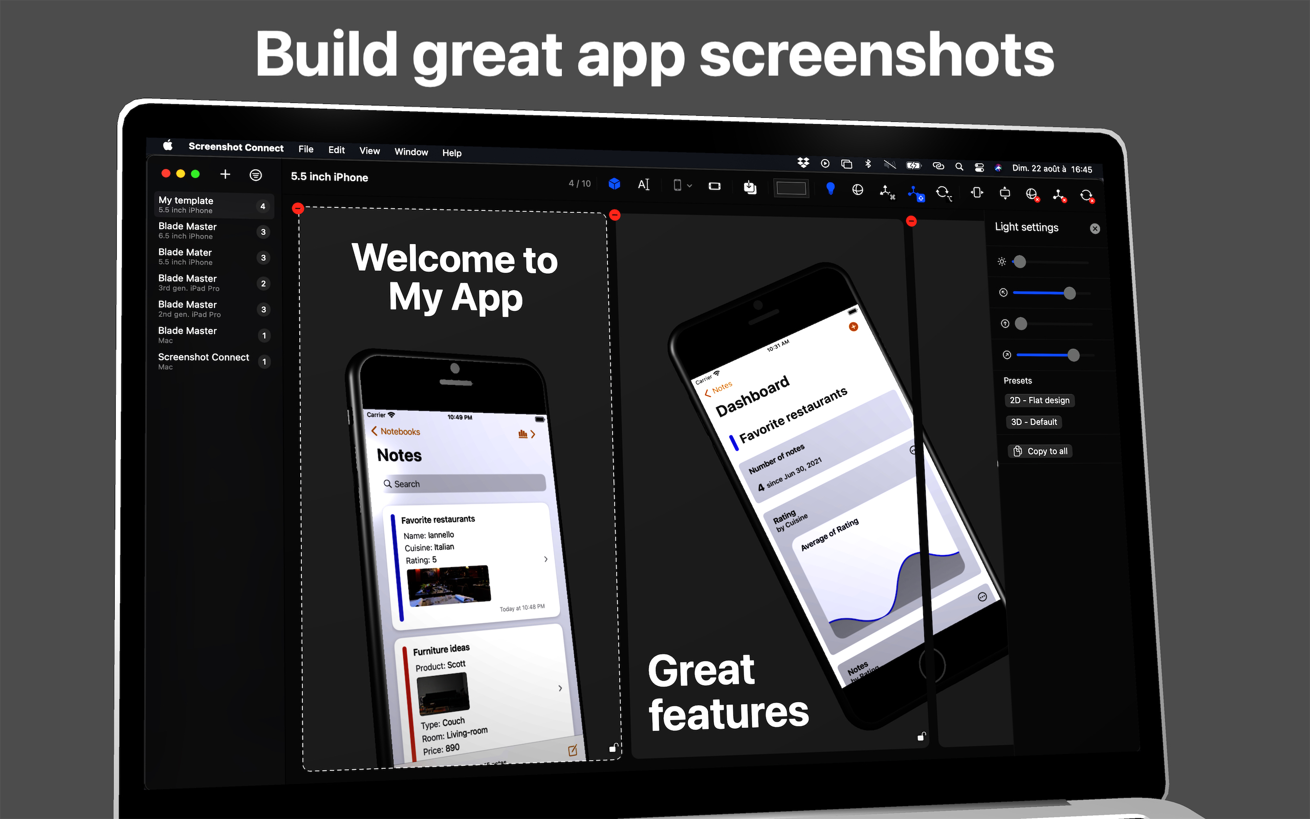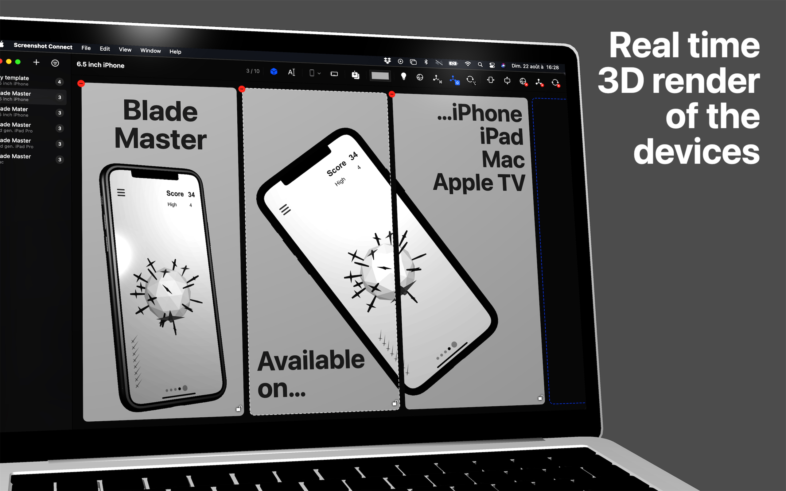 For each screenshot the device is rendered in 3D in real time using Apple Metal framework. Therefore you can rotate, move and adjust the lighting as you want, with real depth and light reflections.